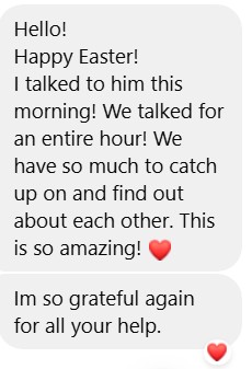 Sunday, five days after our first conversation, Barbie and her dad had a long-awaited conversation. It’s an Easter Miracle! I received this message from Barbie.