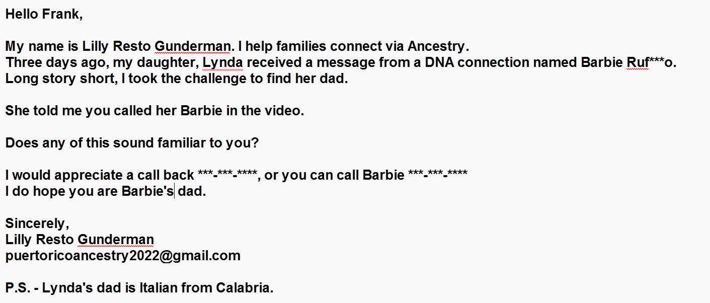 I left a voicemail on the only phone number I found for Frank, and sent several Messenger messages to Frank. I also included a photo of the day Barbie met her grandfather, Raffaele. I expected God would intercede; I prayed God would help Barbie connect with her dad.